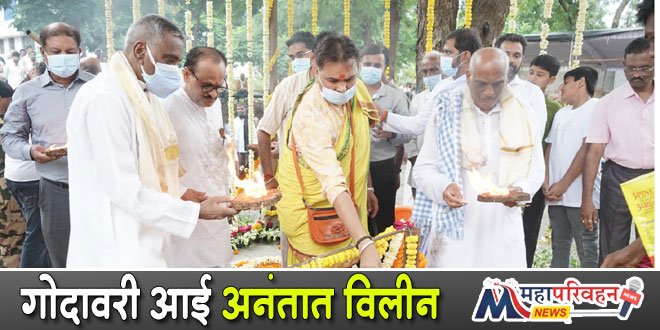 Late Godavari Ai Patil passes away जळगाव (4 सप्टेंबर 2025) : गोदावरी परीवाराच्या आधारस्तंभ श्रीमती गोदावरी आई वासुदेव पाटील (93) यांचे भास्कर मार्केट येथील निवासस्थानी बुधवार, 3 रोजी दुपारी 1.34 वाजता वृध्दापकाळामुळे निधन झाले. गुरूवारी दुपारी 12.30 वाजता गोदावरी फाउंडेशनचे अध्यक्ष माजी खासदार डॉ. उल्हास पाटील यांच्यासह उपाध्यक्ष सुभाष पाटील यांनी त्यांना अग्निडाग दिल्यानंतर गोदावरी आई अनंतात विलीन झाल्या. डॉ. उल्हास पाटील वैद्यकीय महाविद्यालयाच्या परिसरात शोकाकुल वातावरणात पुरोहितांच्या वेदमंत्रोच्चारात स्व. गोदावरी आईंवर अंत्यसंस्कार करण्यात आले. यावेळी परिवारासह आप्तेष्टांच्या अश्रुंचा बांध फुटला.